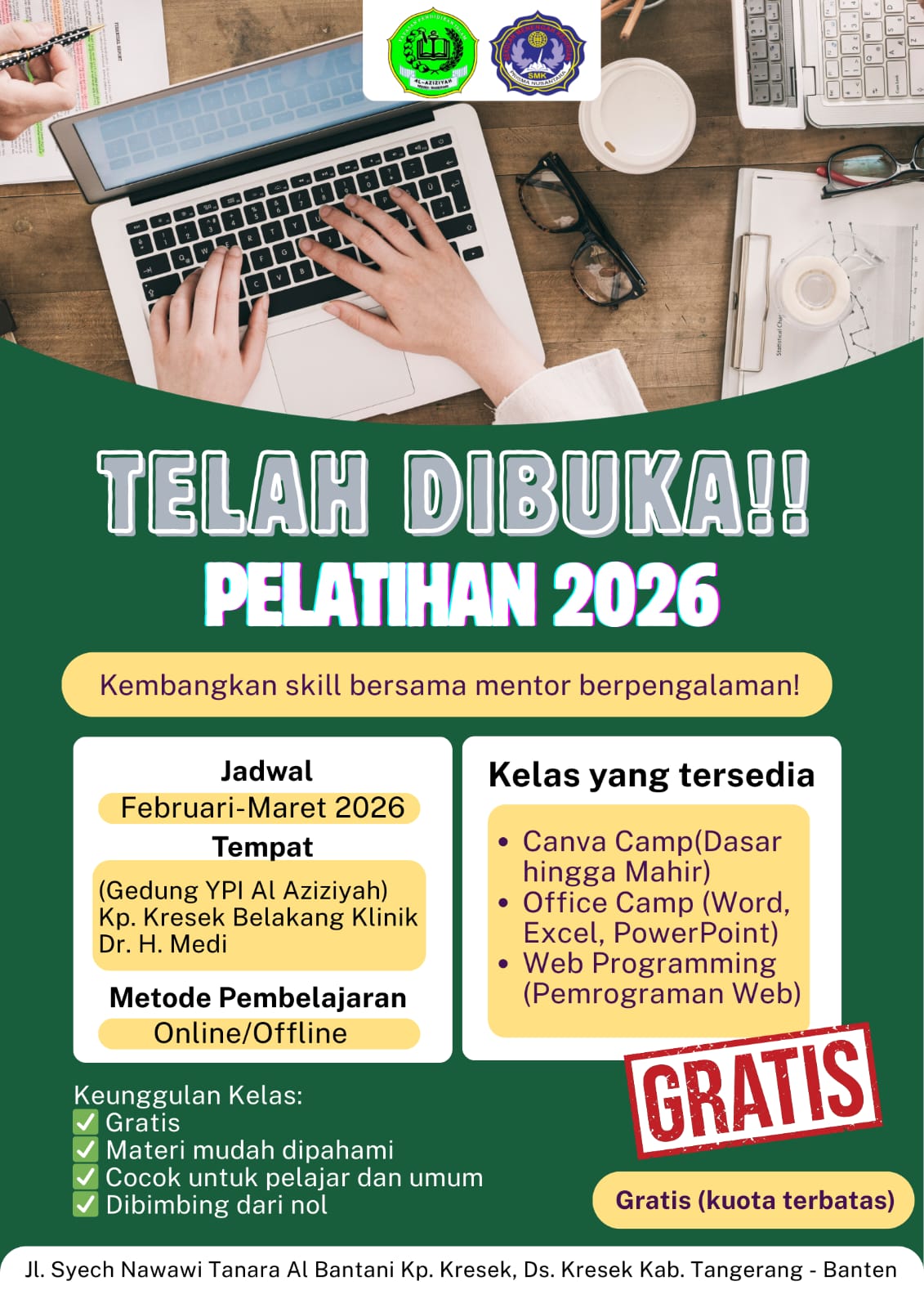 Kapan dan Dimana? π Jadwal: Februari β Maret 2026 π Lokasi: Gedung YPI Al Aziziyah (SMK Prima Nusantara), Kp. Kresek (Belakang Klinik Dr. H. Medi).